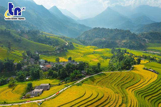 Ngắm nhìn khung cảnh núi non hùng vĩ, không ít người liên tưởng đến “một dãy Alps” trong lòng Sa Pa. Song, lại thân thương và đậm chất Tây Bắc bởi những thửa ruộng bậc thang ôm theo sườn núi. Từng lớp, từng lớp ruộng bậc thang với sắc xanh mướt xen lẫn chín vàng, kéo nhau chạy tít tắp tới chân trời, bao bọc xung quanh là những dãy núi hùng vĩ cùng bầu trời cao xanh tạo nên bức tranh khoáng đạt và thi vị.
